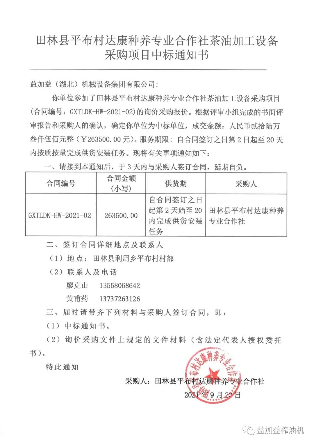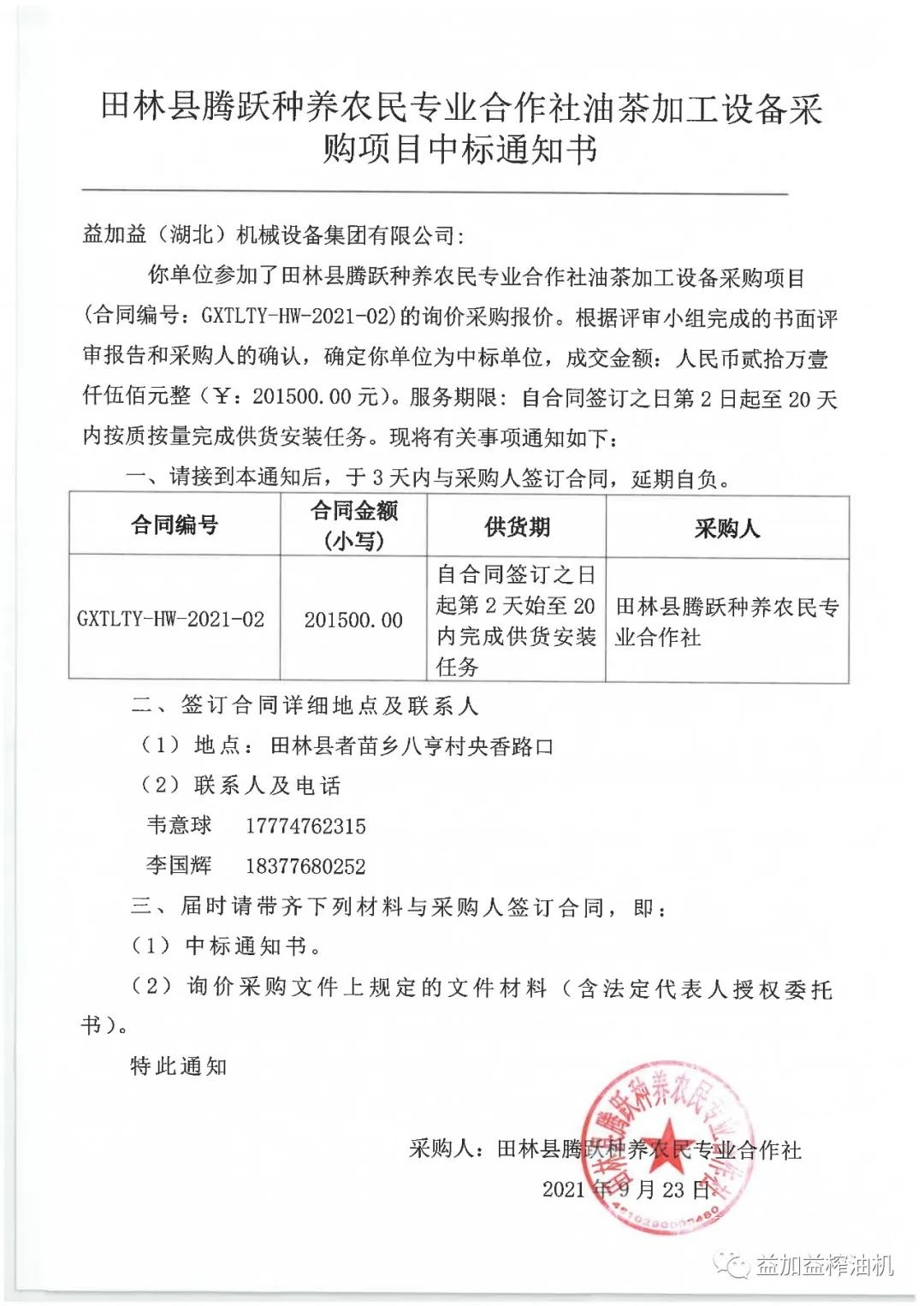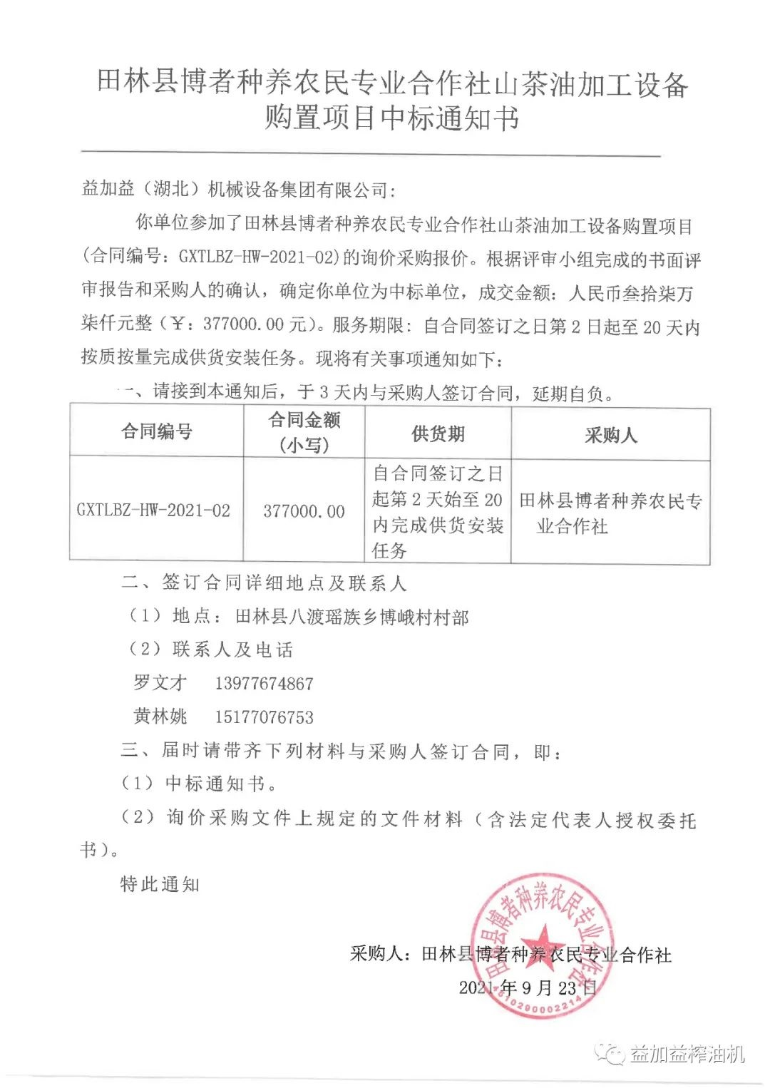 益加益集團(tuán)憑借過(guò)硬的產(chǎn)品質(zhì)量,扎實(shí)高效的工作作風(fēng),卓越的運(yùn)作團(tuán)隊(duì)和良好的企業(yè)信譽(yù),在眾多競(jìng)爭(zhēng)對(duì)手中脫穎而出,連續(xù)中標(biāo)《中華人民共和國(guó)世界銀行貸款廣西貧困片區(qū)農(nóng)村扶貧試點(diǎn)示范項(xiàng)目》中全部11家專業(yè)合作社山茶油加工設(shè)備的招標(biāo)購(gòu)置。
