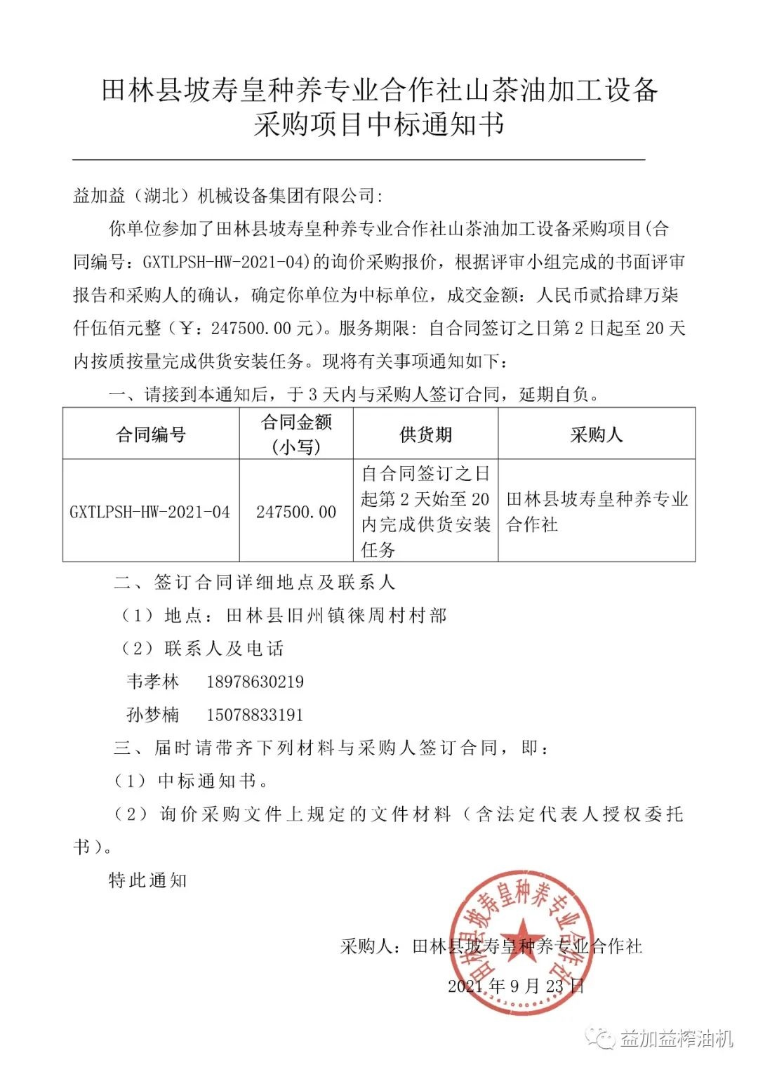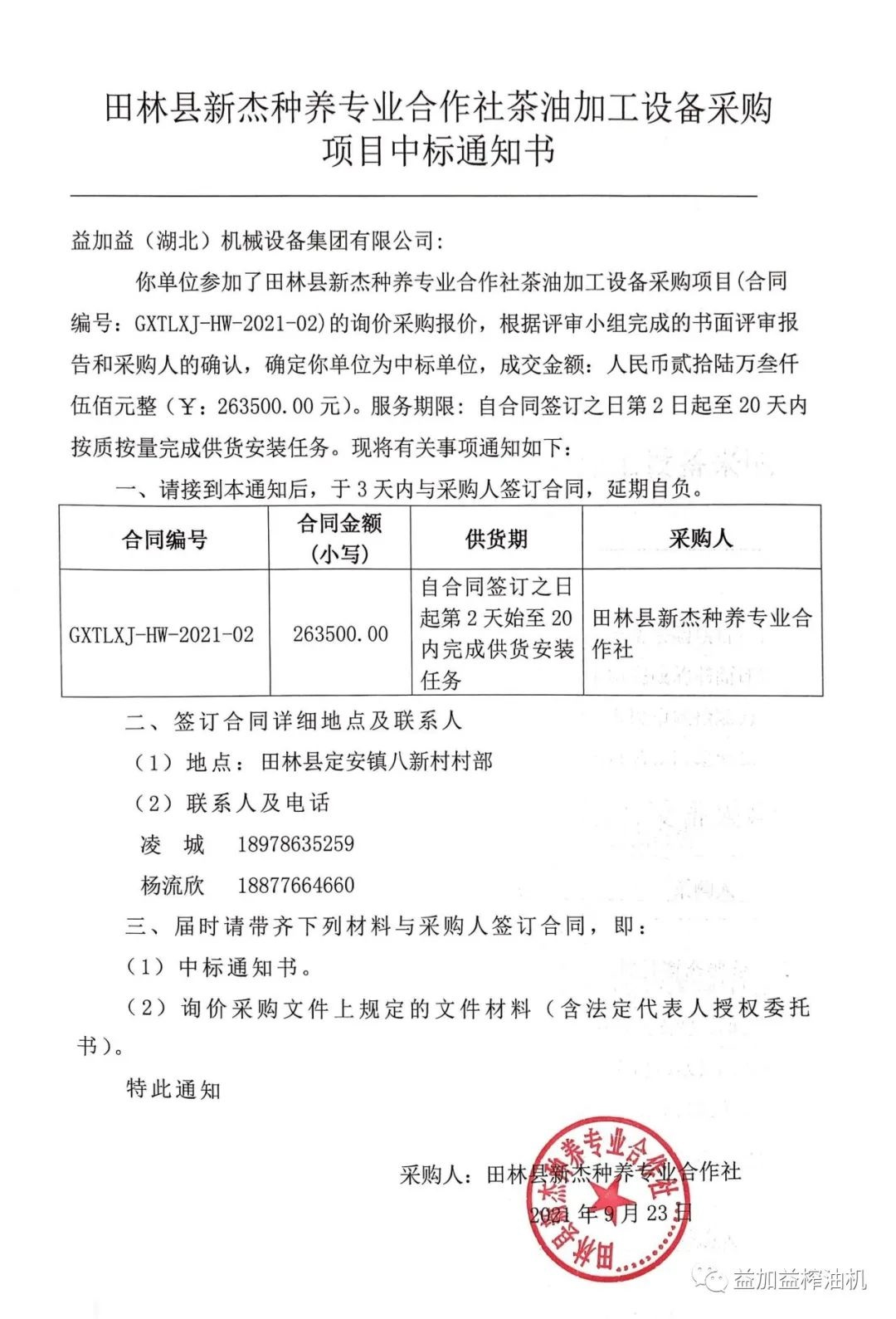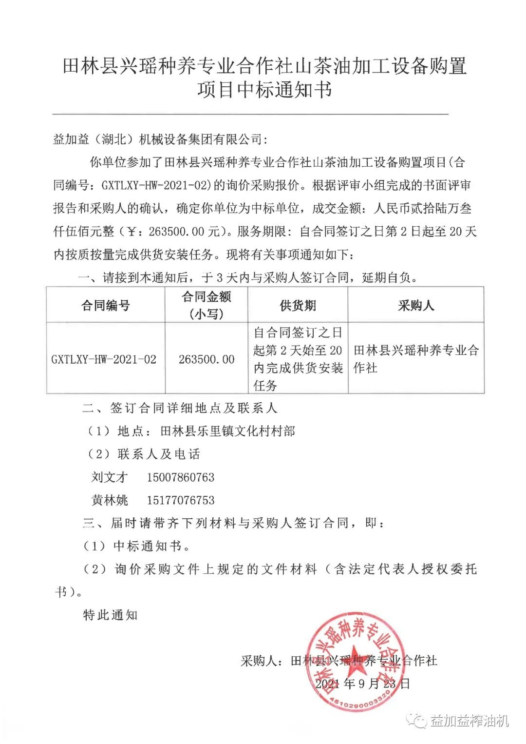 益加益集團(tuán)憑借過(guò)硬的產(chǎn)品質(zhì)量,扎實(shí)高效的工作作風(fēng),卓越的運(yùn)作團(tuán)隊(duì)和良好的企業(yè)信譽(yù),在眾多競(jìng)爭(zhēng)對(duì)手中脫穎而出,連續(xù)中標(biāo)《中華人民共和國(guó)世界銀行貸款廣西貧困片區(qū)農(nóng)村扶貧試點(diǎn)示范項(xiàng)目》中全部11家專業(yè)合作社山茶油加工設(shè)備的招標(biāo)購(gòu)置。