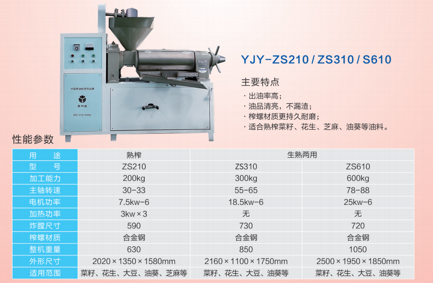 生榨專用一體化榨油機(jī)YJY-ZS210/ZS310/ZS610五大優(yōu)勢